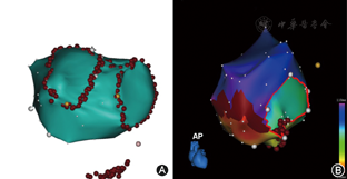 南京医科大学第一附属医院心脏科是参与该试验的电生理中心之一。在该试验中,我们应用哥伦布系统进行三维指导,并全部应用微创公司提供的全套标测、消融电极,成功进行了10余例慢性心房颤动的消融治疗(图1)。在该过程中也积累了一定的应用经验。从术者体验而言,哥伦布系统达到了定位准确的三维标测基本要求;除此,系统对标测电极运动轨迹的反映也比较及时,较好地满足了术者对电极的反馈感知要求。在准确定位基础上,哥伦布系统同样提供激动标测、电压标测等功能。图1B是1例右心房典型心房扑动的激动标测图,根据颜色分布可见围绕三尖瓣环由红到紫呈环形激动,激动几乎覆盖了整个心动周期,符合典型逆钟向心房扑动的特征。该病例显示哥伦布系统能较好满足激动标测的要求。