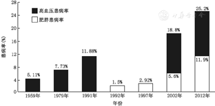 1991年中国高血压抽样调查结果显示,高血压患病率为11.88%,2002年中国居民营养与健康状况调查显示,高血压患病率增至18.8%。2007年至2008年中国糖尿病和代谢紊乱研究组调查高血压患病率为26.6%[15],2010年中国慢性非传染性疾病预防控制中心调查资料则显示成人高血压患病率高达33.5%[16]。《中国居民营养与慢性病状况报告(2015年)》报道,2012年18岁及以上成年人高血压患病率为25.2%(图1)。另外,中国少年儿童高血压的患病率已从1991年的7.1%上升到2004年的14.6%[14]。肥胖与超重也显著增加了儿童高血压患病风险,2012年中国6城市儿童血压调查显示,肥胖、超重和正常体重组的高血压患病率分别为29.1%、17.4%和7.8%,腹型与非腹型肥胖儿童的高血压患病率分别为27.9%和8.4%[17]。