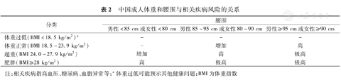 1990年以来中国13项大规模流行病学调查的结果显示,肥胖程度不同,患者合并高血压、糖尿病、血脂异常和危险因素聚集的风险也不同。BMI和腰围超标均与国人高血压及心血管病风险独立相关,二者均超标可进一步增加心血管风险[13](表2)。虽然肥胖增加心血管代谢风险,但又与心血管事件预后存在"矛盾现象"。近年来,国内外数十万人群调查均证实肥胖程度与总死亡率和心血管事件预后存在"矛盾现象",即J形曲线,超重时心血管预后最好[37,38],这对肥胖风险的评估有参考价值。