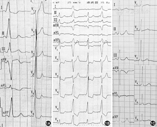 术前患者静息心电图出现3种表现:(1)窦性心律,72次/min,PR间期0.08 s,QRS波群起始部顿挫,可见直立的δ波(图1A),提示存在房室旁路,可明确诊断为预激综合征,V1导联主波向下,考虑为B型预激综合征,δ波直立,初步判断旁路位于右侧游离壁。(2)窦性心律,100次/min,PR间期0.08 s,V1导联主波向上与向下交替出现(图1B),判断此患者至少同时存在左侧及右侧2条旁路,当V1导联主波向上时,说明激动由左侧旁路向下传至心室,此时Ⅰ导联δ波位于等电位线,aVL导联δ波呈负向,一般情况下,随着旁路位置远离冠状窦口的距离,aVL导联负向δ波早于Ⅰ导联出现,且aVL导联的负向δ波深度大于Ⅰ导联,由此可判断,这条旁路位于左后侧壁。当V1导联主波向下时,其形态与图1中的形态大致相同,说明心房冲动通过同一条旁路激动心室。(3)窦性心律,75次/min,PR间期0.08 s,V1导联R∶S=1,其QRS波形不符合任何部位单旁路的心电图特点(图1C),推测可能心房冲动由两侧旁路同时下传激动心室。由以上3个图可以诊断此患者至少存在2条房室旁路,且位于左右两侧。
