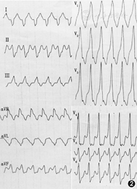 患者心悸时心电图表现为宽QRS波心动过速,RR间期规整,QRS波时限为0.20 s,心室率为214次/min(图2),由于静息时心电图中提示有左右2条房室旁路分别存在的证据,所以此时的心电图可能为环形运动折返于2条旁路之间,但也不排除逆传型房室折返性心动过速可能。