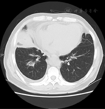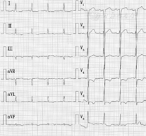 患者男性,58岁,主因"双侧季肋部疼痛伴活动后气短1个月"于2015年12月8日入院。1个月前患者无明显诱因出现双侧季肋部疼痛,深吸气加重,上2层楼后出现呼吸困难,无发热、咳嗽。外院行胸部CT提示"双肺炎性实变,左下叶局限性肺不张,右侧少量胸腔积液,心包少量积液"(图1),予静脉应用莫西沙星8 d,患者自觉症状无改善,并出现双肩和双下肢酸痛,双足背皮肤麻木。7 d前于我院就诊,心电图V4~V6导联ST段压低,Ⅰ、Ⅱ、V4~V6导联T波倒置(图2)。肌酸激酶同工酶MB (CK-MB) 31 U/L,肌钙蛋白T 1.4 μg/L,N末端B型利钠肽原(NT-proBNP) 4 399 ng/L。以"心力衰竭、急性非ST段抬高型心肌梗死(NSTEMI)"收入我科。自发病以来,患者神清,家属觉患者言语减少,反应迟钝,夜间睡眠较差,大小便无明显改变,体重近1个月下降5 kg。既往史:过敏性鼻炎病史13年,3年前开始规律应用丙酸氟替卡松喷雾剂,控制稳定。支气管哮喘13年,3年前开始应用沙美特罗替卡松,控制稳定。高血压病史15年,2型糖尿病史10余年,吸烟30年,25支/d,已戒11年,无饮酒嗜好。否认家族性遗传病史。入院查体:体温36.8 ℃,脉搏90次/min,呼吸16次/min,血压102/70 mmHg(1 mmHg=0.133 kPa)。神清,对答反应迟钝,计算力、近记忆力差。右肩胛下角线第9肋间以下叩诊浊音,听诊呼吸音减低,双下肺闻及吸气相湿啰音,无胸膜摩擦音。心界向左扩大,心率90次/min,律齐,心音有力,A2>P2,未闻及杂音,无心包摩擦音。腹部查体未见异常,双下肢胫前可凹性水肿。四肢肌力Ⅴ级,左小腿针刺感稍差。血常规示白细胞计数11.8×109 /L,血红蛋白130 g/L,血小板计数251×109 /L,嗜酸性粒细胞42.4%明显升高。尿常规示尿蛋白(1+),未见镜下血尿。