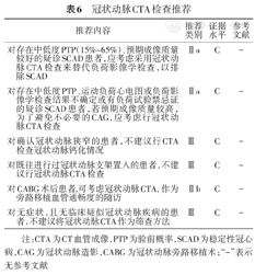| 对存在中低度PTP(15%~65%)、预期成像质量 较好的疑诊SCAD患者,应考虑采用冠状动 脉CTA检查来替代负荷影像学检查,以排 除SCAD | Ⅱa | C | - |