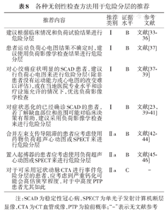 负荷心电图简单易行,对疑诊冠心病且中低PTP(15%~65%)患者,推荐行12导联负荷心电图。负荷心电图具有诊断意义的异常变化包括负荷运动过程中心电图2个以上导联J点后0.06~0.08 s的ST段出现水平或下斜性下移≥0.1 mV。但约15%的SCAD患者,具有诊断意义的ST段变化发生在负荷试验恢复期。具体推荐见表4。