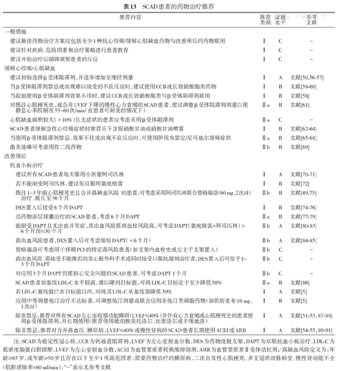 注:SCAD为稳定性冠心病,CCB为钙通道阻滞剂,LVEF为左心室射血分数,DES为药物洗脱支架,DAPT为双联抗血小板治疗,LDL-C为低密度脂蛋白胆固醇,LVEF为左心室射血分数,ACEI为血管紧张素转换酶抑制剂,ARB为血管紧张素Ⅱ受体拮抗剂;a高缺血风险定义为:年龄≥65岁,或年龄≥50岁且存在以下至少1项高危因素:需要药物治疗的糖尿病、二次自发性心肌梗死、多支冠状动脉病变、慢性肾动能不全(肌酐清除率<60 ml/min);"-"表示无参考文献