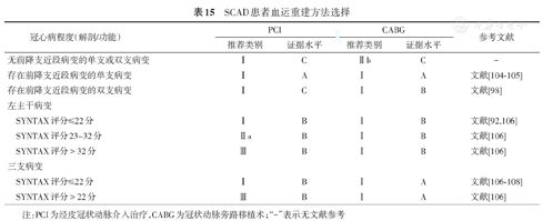 对合并左主干和/或前降支近段病变、多支血管病变患者,选择CABG抑或PCI仍有争议。近年药物洗脱支架的广泛应用显著降低了PCI术后长期不良事件发生率,PCI在SCAD中的适应证逐渐拓宽。建议对上述患者,根据SYNTAX评分和SYNTAXⅡ评分评估其中、远期风险,选择合适的血运重建策略。