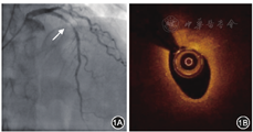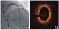 2015年5月11日行冠状动脉造影检查,结果显示:左主干正常;左前降支近段狭窄程度为95%,中远段狭窄程度为30%,血流心肌梗死溶栓试验(thrombolysis in myocardial infarction,TIMI)分级为2~3级;左回旋支远段狭窄程度为70%;右冠状动脉近远段狭窄程度为20%~30%,血流TIMI分级为3级(图1A)。因左前降支近段病变严重,先行球囊预扩张,然后行光学相干断层成像(optical coherence tomography,OCT)检查。OCT结果示最小管腔面积为2.57 mm2,斑块负荷为85.3%(图1B)。以非顺应性高压球囊再次预扩张后,经导丝推送3.5 mm×24 mm NeoVas生物可吸收支架[乐普(北京)医疗器械公司]至左前降支近段病变处,以12 atm(1 atm=101.325 kPa)释放支架。以非顺应性高压球囊后扩张进行支架内整形后,再次行冠状动脉造影和OCT检查(图2)。OCT检查结果示支架扩张满意,贴壁良好,平均管腔面积为7.15 mm2,最小管腔面积为5.85 mm2,斑块负荷为18.6%。术后规律口服阿司匹林肠溶片100 mg(每天1次),替格瑞洛片90 mg(每天2次),阿托伐他汀钙片20 mg(每晚1次)。