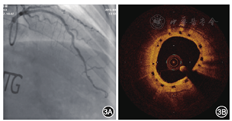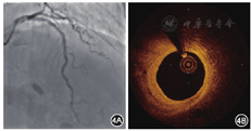 2016年4月27日行冠状动脉造影检查,结果显示:左主干正常;左前降支近段支架通畅,无再狭窄,中远段狭窄程度为30%;左回旋支远段狭窄程度为70%;右冠状动脉近远段狭窄程度为20%~30%(图3A)。OCT检查结果示左前降支近段支架内膜覆盖良好,平均管腔面积为5.78 mm2,最小管腔面积为4.86 mm2,斑块负荷为30.6%,新生内膜面积为2.84 mm2(图3B)。术后口服阿司匹林肠溶片100 mg(每天1次),替格瑞洛片90 mg(每天2次,至2016年5月11日),阿托伐他汀钙片20 mg(每晚1次)。