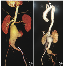 综上,以腹主动脉瘤破裂为首发症状的MFS病情凶险,且术后仍有可能在主动脉其他部分发生动脉瘤或夹层。长期密切的临床和影像学随访,监测主动脉病变的进展十分重要。