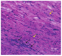 患者男,22岁,主因"突发前胸、后背疼痛2 h"于2019年3月24日入我院血管外科。患者3年前因下腹部剧烈疼痛、突发昏厥于我院就诊,超声提示腹主动脉瘤,腹腔穿刺可穿出不凝血。胸腹主动脉CT血管成像(CT angiography,CTA)提示腹主动脉瘤破裂出血,腹腔积血,腹主动脉直径最大为75 mm(图1A)。患者有吸烟史5年,20支/d,偶有饮酒。家族中其母患马方综合征(Marfan syndrome,MFS),已病故。入院诊断为马方综合征,急诊行"腹主动脉+左侧髂动脉置换术",术后恢复良好出院。今患者于2 h前突发前胸、后背疼痛再次入院。入院体格检查:体型瘦长,四肢、手足细长,蜘蛛指趾,高度近视腹肌紧张,呈板状腹。入院辅助检查:胸腹主动脉CTA(图1B)示:急性主动脉夹层(Stanford A型),破口位于主动脉根部,升主动脉夹层累及整个主动脉弓和降主动脉,主动脉弓部瘤样扩张,且在既往腹主动脉瘤手术部位旁,即肾动脉分支处形成大动脉瘤。超声心动图示:心包腔内可见细线样液性暗区,较厚处约0.4 cm。诊断:急性A型主动脉夹层。急诊行"升主动脉置换+主动脉弓置换+象鼻支架术+腹主动脉置换术"。术后病理(图2):动脉壁标本HE染色显示中膜变性,大量炎细胞浸润,平滑肌细胞增殖,形成较大间隙。术后积极给予输血、补液、抗炎、抑酸、营养心肌等对症支持治疗。但患者终因继发严重感染、多器官功能障碍于2019年3月27日院内死亡。