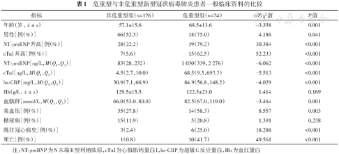 危重型组患者的年龄大于非危重型组,hs-CRP和血肌酐水平均高于非危重型组(P均<0.05)。危重型组患者中男性、NT-proBNP升高、cTnI升高以及患有高血压、既往冠心病史者的比例均高于非危重型组(P均<0.05),且危重型组患者NT-proBNP和cTnI水平均明显高于非危重型组(P均<0.05)。两组患者患有糖尿病的比例及Hb水平差异均无统计学意义(P均>0.05)。