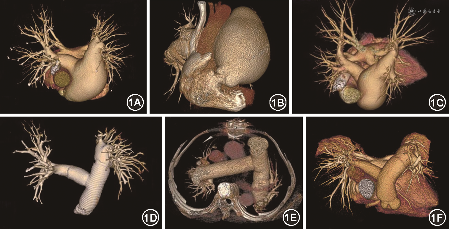 病例2 女性,50岁,因“外伤后发现心包占位1 d”于2018年6月就诊于郑州大学第一附属医院。近半年来患者偶有胸闷,活动后加重。入院体格检查未见明显阳性体征。术前超声心动图结果示:主肺动脉及左右肺动脉瘤样扩张,右肺动脉起始部异常回声(考虑血栓形成),肺动脉瓣少量反流,右心室前后径15 mm,EF 60%。肺动脉CT(图1C):左肺动脉及左右肺动脉全程瘤样扩张(直径分别约为120、45、53 mm)。术前各项实验室检验结果未见明显异常。诊断为:肺动脉瘤、肺动脉血栓、肺动脉高压。于入院后第10天行手术治疗。采用正中开胸,常规建立体外循环。探查见巨大PAA,累及主肺动脉及左右肺动脉(直径分别约122、45、55 mm),右肺动脉起始部可见30 mm×50 mm陈旧性血栓,肺动脉瓣及窦部正常。并行循环下切除PAA,切除范围:近端至肺动脉窦管交界处,右侧至右肺动脉分叉以远处,左侧左肺动脉近心包处。取26# 人工血管(德国Maquet公司)与右下肺动脉行端端吻合并侧壁开窗,14#人工血管与右上肺动脉行端端吻合后吻合在26#人工血管上。主肺动脉至左肺动脉使用28#人工血管替换并侧壁开窗,右肺动脉26#人工血管端侧吻合于主肺动脉人工血管上。手术时间、体外循环时间及阻断时间分别为185、80、0 min。手术顺利,患者术后返回恢复室,术后第2日拔除气管插管,呼吸机使用时间37 h。术后超声心动图示:人工血管血流通畅,右心室前后径15 mm,EF 62%,肺动脉压力66 mmHg。术后肺动脉CT示:肺动脉血管血流通畅(图1D)。患者于术后10 d顺利出院,口服华法林抗凝半年。