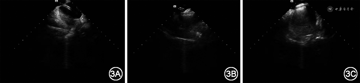 2020年3月8日在局麻下行心腔内超声(ICE)指导房间隔穿刺PFO封堵术。采用强生Cartosound心腔内超声导管,直径10 Fr(3.2 mm),工作长度90 cm,操作手柄具有强力微调技术,保持弯度,前(A)、后(P)、左(L)、右(R)四向160°打弯,从任意角度观察心脏内解剖结构及位置,相控阵超声探头频率4.5~11.0 MHz,将Cartosound导管通过Swifilink连接装置与西门子SC2000彩色多普勒超声诊断仪相连。穿刺右侧股静脉,置入11 F鞘管,ICE导管经右侧股静脉穿刺插管送入右心房,分别进行二维、彩色多普勒血流显像和连续多普勒检查,观察PFO的解剖形态、周边结构以及血流力学,并在二维图像上测量基础状态PFO通道的直径和长度。常规消毒、局部麻醉后穿刺右股静脉,送入动脉鞘管,将带有引导钢丝的房间隔穿刺鞘管经右股静脉穿刺送入上腔静脉,沿上腔静脉下滑至卵圆窝处,ICE导管显示“起始扇面”,顺时针旋转至左肺静脉扇面,打“P”弯至主动脉根部出现,打“R”弯显示上腔静脉,同时展示卵圆孔的整体形态,调整房间隔穿刺鞘管,并可看到“帐篷顶”。突破房间隔后,注射生理盐水左心房内可见气泡显影,确认穿刺成功。将端孔导管通过PFO经左心房送至左上肺静脉,导入0.035英寸(1英寸=2.54 cm)260 cm长加硬钢丝,送入输送鞘管(图3A),选择合适的PFO封堵器并安装至输送杆上,在ICE引导下穿过PFO进入左心房,并确保钢丝位于左上肺静脉内,将封堵器沿输送鞘管送至左心房,依次释放左心房盘面、腰部及右心房盘面(图3B),ICE实时观察封堵器形状及位置均良好(图3C),超声造影证实封堵效果满意(无RLS,二、三尖瓣未受累等),心电图监测无传导阻滞,释放封堵器。手术成功,术后给予抗血小板、抗凝治疗。术后3个月随访,复查TTE显示封堵伞位置良好,右心声学造影未见RLS。
