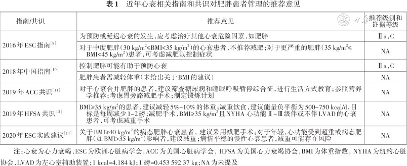 近年心衰相关指南和共识对肥胖患者管理的推荐意见