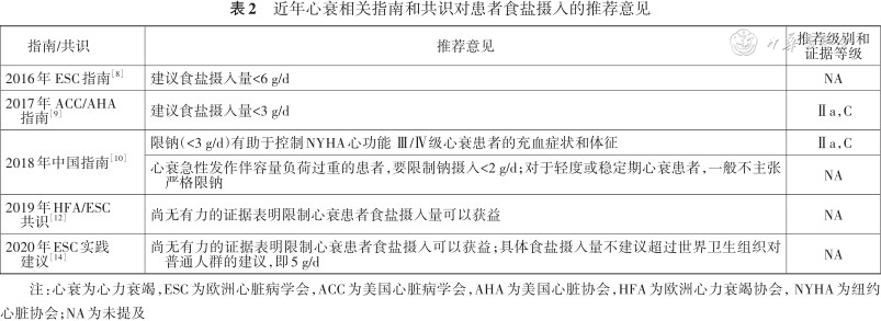 | 2020年ESC实践建议[14] | 尚无有力的证据表明限制心衰患者食盐摄入可以获益;具体食盐摄入量不建议超过世界卫生组织对普通人群的建议,即5 g/d | NA |