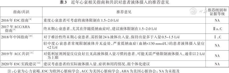近年心衰相关指南和共识对患者液体摄入的推荐意见