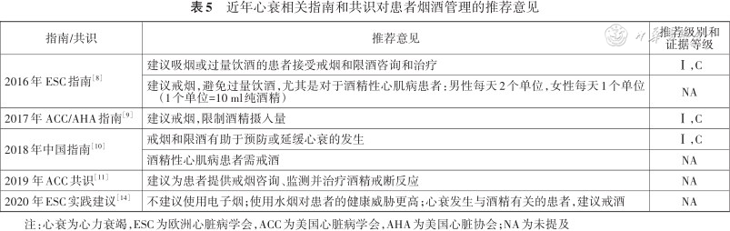 | 2020 年ESC实践建议方正汇总行[14] | 不建议使用电子烟;使用水烟对患者的健康威胁更高;心衰发生与酒精有关的患者,建议戒酒 | NA |