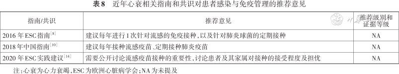 8.感染与免疫:流感病毒感染是引起心血管事件的重要诱因[30],心衰患者很容易受到病毒感染,如正在流行的2019新型冠状病毒(2019-nCoV)。Rodrigues等[31]对179 158例心衰患者进行荟萃分析的结果显示,流感疫苗接种与心衰患者全因死亡率降低相关。相关心衰指南建议每年进行1次流感疫苗接种,定期接种肺炎疫苗[8,10]。相关指南和共识关于心衰患者感染与免疫管理的推荐意见详见表8。