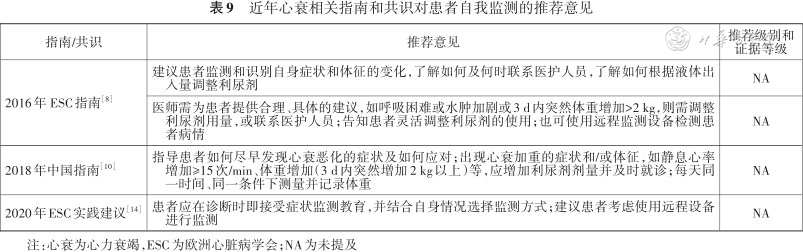 9.自我监测:出院后疾病的监测可由患者本人或医师通过远程设备进行。为了减少心衰再住院和死亡事件,及早通过密切监测病情发现心衰症状恶化至关重要[8,10]。心衰患者有必要在确诊时即接受病情监测教育,并了解如何应对病情变化。新型冠状病毒肺炎的流行使得人们重新关注患者的自我监测。除了症状,对于药物不良反应的监测也非常重要,应教会患者哪些情况属于正常反应无需停药,并与患者分享如何应对不良反应。相关指南和共识关于心衰患者自我监测的推荐意见详见表9。
