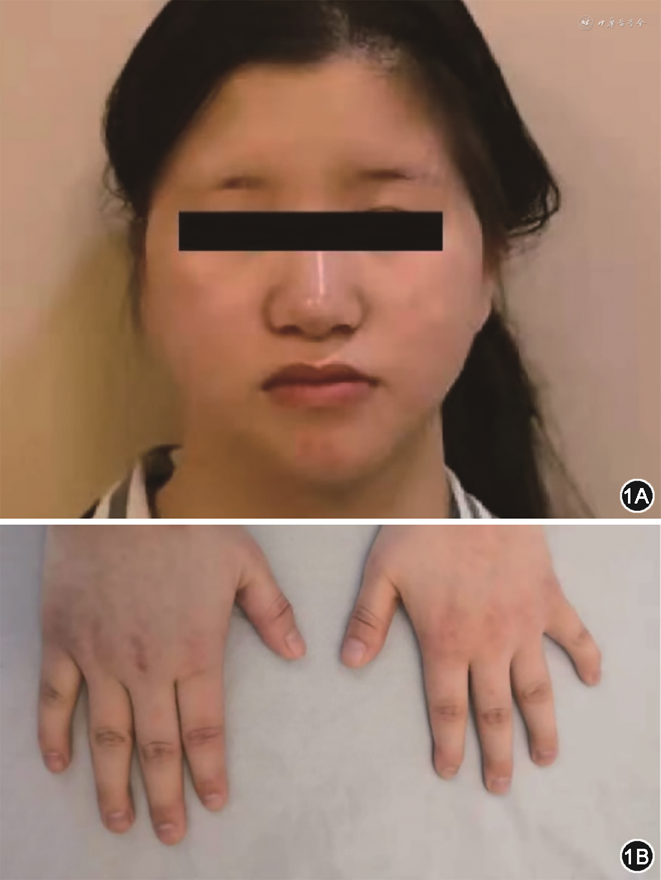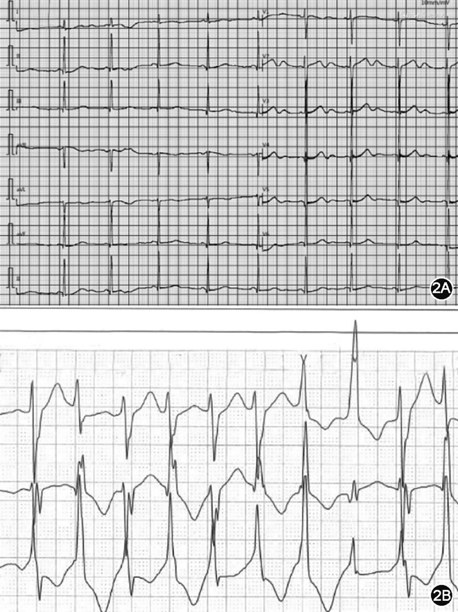 患者女,19岁,因“双下肢无力6年余,反复晕厥4年,再发6 d”于2021年3月17日收住浙江大学附属第二医院心内科。2014年始患者无明显诱因出现双下肢无力,主要为双小腿部,走路或上楼梯时加重,持续3~7 d可自行缓解。当时查体:双下肢肌力5-级,四肢腱反射减弱,双下肢关节位置觉稍差。血液检查:血钾2.97 mmol/L。心电图:窦性心律,频发室性早搏,QT间期延长,可见T-U融合。心脏超声未见明显异常。动态心电图可见频发多源性室性早搏,短阵双向室性心动过速(室速)。肌电图提示周期性麻痹。患者全外显子基因测序结果提示KCNJ2基因突变,突变位点类型p.G215D。临床诊断为Andersen-Tawil综合征(Andersen-Tawil Syndrome,ATS)1型(ATS1),阵发性室速。患者服用普萘洛尔和阿替洛尔均不能耐受,表现为咽喉部极度不适感,长期服用醋甲唑胺、倍他乐克和辅酶Q10。患者于4年前行走时再发心悸、头晕,随即意识丧失,2~3 min后自行恢复意识,无大小便失禁,此后晕厥反复发作3次;6 d前再次发作,于浙江大学附属第二医院住院。既往病史无特殊,父母非近亲结婚,父母及其姐姐基因检测均呈阴性。入院查体:脉率75 次/min,血压107/52 mmHg(1 mm Hg=0.133 kPa)。神志清,精神可,宽眼距,低耳廓,宽鼻,小下颌(图1A),双手第5小指弯曲(图1B)。心率75 次/min,心律不齐,心音中等,未闻及明显杂音及心包摩擦音;心电图提示窦性心律,左心室高电压,QT间期延长(QT/QTc间期448/504 ms),U波显著(图2A)。心脏超声心动图和心脏增强磁共振检查未见明显异常。心电监护见频发多源性室性早搏,室性二联律,非持续性室速,多数呈双向性室速,QT间期延长,U波宽大(图2B)。于2021年3月23日置入置入式心脏复律除颤器(implantable cardioverter defibrillator,ICD;Evera DDBC3D1,美敦力公司,美国)。术后程控以100 次/min起搏,心电图提示心房起搏心律,QT/QTc间期360/467 ms,心电监护未见室性心律失常,于2021年3月25日出院。术后1个月随访,心电图和ICD程控未见室速再发。