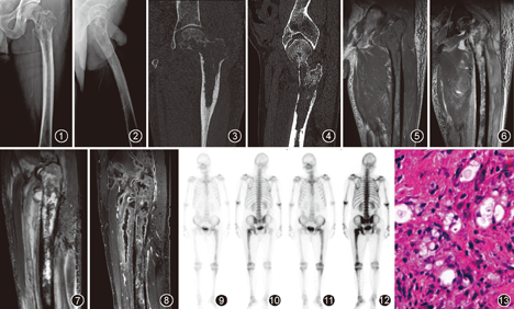 影像表现:X线示左侧股骨上段骨干、股骨颈不规则骨质密度减低,累及长度约9.3 cm,骨皮质变薄,未见骨膜反应,周围软组织肿胀、密度增高(图1, 图2)。CT平扫示左侧股骨上段骨干、股骨颈不规则骨质破坏,股骨头受累,局部骨皮质不连续,内可见小片状死骨影及少量硬化骨嵴,边缘可见轻度骨膜反应,周围软组织肿胀、密度不均(图3, 图4)。MRI显示病变范围较CT广,向下达左股骨中段,上下长约18 cm,骨髓腔内信号异常,T1WI、T1WI压脂呈不均匀等低信号;T2WI、T2WI压脂及质子密度加权成像(PDWI )均呈不均匀高信号;增强扫描呈不均匀强化,骨内外均可见多个大小不一的脓腔,呈环形强化,部分脓腔内见分隔(图5, 图6, 图7, 图8)。单光子发射性计算机断层显像(SPECT-CT)示病变区域血液灌注增加并核素浓聚,左股骨中下段及左膝关节弥漫性核素轻度浓聚(图9, 图10, 图11, 图12)。根据影像诊断为左股骨上段及软组织感染性病变。