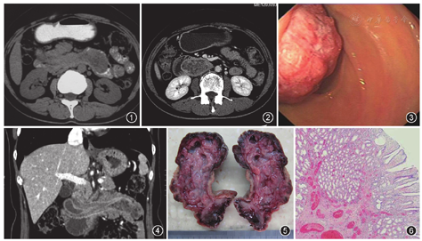 女,49岁。因间断腹痛、黑便1年余,加重8 d入院。体检:贫血貌,腹软,右上腹压痛、无反跳痛及肌紧张。实验室检查:红细胞2.7×1012/L(正常参考值:3.5×1012~5.0×1012/L),血红蛋白76 g/L(正常参考值110~150 g/L),消化道肿瘤标志物均未见异常。入院前1个月腹部CT平扫示空肠近段腔内软组织肿块,其内密度欠均匀,十二指肠降段与水平段结构紊乱(图1)。入院后行腹部增强CT示十二指肠降段与水平段交界区内见腔内不均匀强化高密度影,部分边界不清,大小为2.5 cm×2.4 cm(图2);近段空肠腔内未见病变,诊断为十二指肠降段肿物并十二指肠空肠套叠。因患者症状持续,3 d后复查胃镜及腹部增强CT,胃镜示十二指肠降段内见一巨大肿物,大小为7.0 cm×3.0 cm,有一粗蒂,其基底部位于降部入口,肿物头端粗糙,触之易出血,近基底部分肿物表面光滑(图3);增强CT扫描见近段空肠一轻度强化的团块状软组织密度影,十二指肠降段部分及水平段向远侧小肠内套入,局部呈4层肠壁结构,肿物头侧并见多个囊状低密度影(图4)。综合多次CT与胃镜检查结果,诊断为十二指肠降段肿瘤并复发性肠套叠。