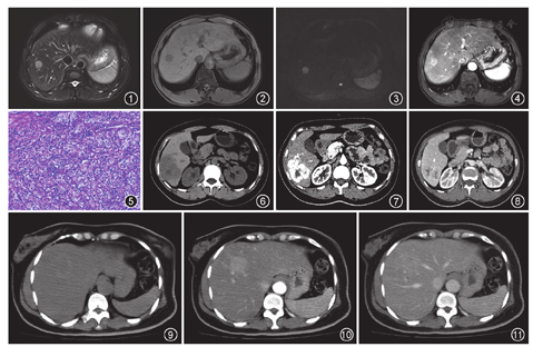 例1男,65岁。剑突下钝痛5个月,外院CT检查提示肝S8段占位性病变。实验室检查:乙肝表面抗原、e抗原和核心抗体阳性(大三阳),癌胚抗原(CEA)值为10.9 ng/ml(正常参考值为0~5 ng/ml)。MRI检查:肝S8段2.5 cm×1.8 cm结节,边界清楚。T2WI呈稍高信号(图1);T1WI呈低信号(图2);DWI可见扩散受限(图3);动态增强扫描动脉早期强化较明显,静脉期强化程度稍减低,但始终高于周围肝实质,病灶中央可见小索条状、斑点状低强化区(图4)。手术所见:肿物位于S8段,边界清楚,行肝S8段肿物切除术。术后病理:组织中可见大量淋巴细胞、浆细胞浸润,异型大细胞条呈索状或片巢状生长,核空泡状,核分裂象易见(图5)。免疫组织化学:Ki67 40%阳性(+),白细胞共同抗原(LCA)、CD3、CD20、CA153、CD110灶性、CD34血管、CK19部分阳性(+),肝细胞特异性抗原(Hepatocyte)、甲胎蛋白(AFP)、EB病毒原位杂交(EBers)阴性。病理诊断:淋巴上皮瘤样癌(lymphoepithelioma-like carcinoma,LELC),周围肝组织汇管区少许淋巴细胞浸润。