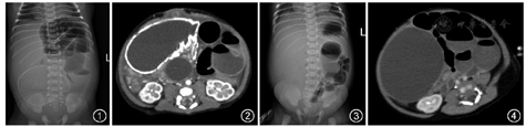 例2女,3 h,因呕吐、未排便于2016年2月14日就诊。母体孕36周超声提示肝脏下方低回声占位,G1P1,足月顺产,出生体重3.6 kg。体检:腹胀,右腹扪及较大肿物。立位腹平片示充气扩张肠管位于左腹部,右腹部致密(图3)。腹部CT检查示右腹低密度为主的边界清晰囊性占位,部分囊壁钙化,增强CT检查无强化效应,腹部肠管扩张并有气液平面(图4)。术中见右下腹巨大包裹性肿物与周围组织粘连,切开吸出大量胎便,距Treitz韧带90 cm处小肠扭转并广泛粘连。
