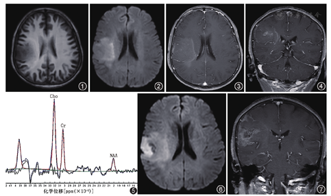影像表现:头颅常规MRI(2016年6月30日)表现:右侧额顶叶见片状稍长T1、稍长T2信号,边界不清,内见散在小片状长T1、长T2信号,DWI(b=1 000 s/mm2)扩散受限呈不均质高信号,增强后强化程度较对侧正常区域稍增加,内部散在片絮状及环状明显强化的区域,病灶外围见多发线状强化,病灶周围未见明确水肿带,病灶区脑沟稍变窄,右侧脑室形态正常(图1,图2,图3,图4)。头颅功能MRI(2016年6月30日)表现:对患者进行单体素MRS扫描,选取生化代谢物指标:N-乙酰天冬氨酸(N-acetylaspartic acid,NAA)、胆碱(Choline,Cho)及肌酸(Creatine,Cr)。MRS分析结果:病灶内明显强化区域NAA/Cr 0.29,Cho/Cr 2.18,Cho/NAA 7.63(图5);正常对照区域NAA/Cr 2.56,Cho/Cr 0.96,Cho/NAA 0.37。同时还对该患者进行MR动态对比增强(dynamic contrast enhancement,DCE)扫描,采用Extended Tofts Linear模型进行后处理分析,选取反映微血管通透性的定量参数指标:容积转移常数(Ktrans)、回流速率常数(Kep)及血管外细胞外容积分数(Ve),选取T1灌注指标为脑血容量(cerebral blood volume,CBV)。DCE分析结果:病灶内明显强化区域Ktrans=1.100 min-1,Kep=1.080 min-1,Ve=0.770,CBV=82.752 ml/g;线状强化右侧肿瘤区域Ktrans=1.137 min-1,Kep=1.692 min-1,Ve=0.651,CBV=75.364 ml/g;线状强化左侧可能正常区域Ktrans=0.012 min-1,Kep=0.099 min-1,Ve=0.179,CBV=52.857 ml/g;对侧正常区域Ktrans=0.003 min-1,Kep=0.118 min-1,Ve=0.100,CBV=47.446 ml/g。复查头颅MRI(2016年8月17日)表现:DWI(b=1 000 s/mm2)扩散受限程度较前片(2016年6月30日)明显,范围较前片增大,增强后病灶内部明显强化的区域增大,由前片斑片状发展为片状,内部出现囊变坏死,病灶外围线状强化消失,局部软脑膜可见强化(图6,图7)。