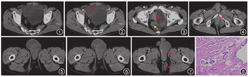 CT表现:CT检查提示盆腔内见巨大不规则形多房囊性肿块,内见大量囊性低密度及少量实性分隔,与前列腺分界欠清,膀胱及直肠受压移位,增强扫描囊壁及分隔可见强化(图1,图2,图3);病变向下突入阴囊及会阴部,局部分叶明显,阴囊内肿块见稍多实性成分,增强后轻度强化(图4,图5,图6,图7)。诊断:盆腔、阴囊及会阴部巨大囊实性占位性病变,侵袭性血管黏液瘤可能。