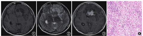 影像表现:外院CT检查示左侧额叶高低混杂密度影,界限不清。本院MRI平扫及增强:病变呈混杂信号,部分边缘模糊不清,大小约5.1 cm×4.4 cm,边缘见多发囊性信号影,呈花瓣样排列,实性部分在T1WI呈等信号(图1),T2WI呈等信号(图2),液体衰减反转恢复(FLAIR)序列呈等及稍高信号,DWI呈等信号影,病变累及胼胝体膝部及左侧基底节,并突向右侧额叶,包绕左侧脑室前角、体部的前部,周围见大片水肿,局部中线右移。增强扫描实性部分明显强化,囊性部分可见边缘强化(图3)。
