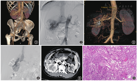 男,47岁,因胸闷、右侧腰痛10 d余于2017年2月24日入我院泌尿外科。外院超声提示:左心房、左心室扩大,二尖瓣、主动脉瓣关闭不全,左心室收缩功能不全,右肾内异常回声(考虑动静脉瘘)。入院诊断:高血压病;心脏扩大,心功能Ⅲ级;右肾动静脉瘘(renal arteriovenous fistula,RAVF)。入院CTA:右RAVF,肾周多发迂曲小血管(图1)。实验室检查:尿常规隐血强阳性,尿红细胞175个/μl,余结果正常。患者入我科于3月7日行介入治疗,术中行右肾动脉造影见右肾多支增粗的供养动脉及大片紊乱的动静脉畸形及明显的动静脉瘘,右肾静脉及下腔静脉快速显影(图2),与术前CTA表现符合。右侧腰2、腰3动脉造影,显示参与右肾异常供血,分别超选至病变血管内,应用350~560、560~710 μm聚乙烯醇(polyvinyl alcohol,PVA;杭州艾力康医药科技有限公司)颗粒栓塞至血流阻断,应用6 mm×14 cm、3 mm×3 cm弹簧圈(Cook,美国)巩固栓塞畸形血管团,造影未见异常血管显影,右肾下极血管正常给予保留。术后患者胸闷、腰痛症状消失,恢复良好出院。于2017年5月16日再次因腰痛就诊,疼痛症状同前,行肾动脉CTA检查,仍考虑为右RAVF(图3),未入院治疗。于2017年8月23日再次入院,行右肾动脉造影,仍可见大片状畸形血管显影及动静脉瘘形成(图4),保留的右肾下极血管也参与异常供血,右侧腰1~腰3动脉参与右肾异常供血,行右肾动脉需完全栓塞术。术中用350~560 μm PVA及6 mm×14 cm、3 mm×3 cm弹簧圈栓塞右肾动脉及参与供血的右侧腰动脉。术后腰痛症状再次缓解并康复出院。患者于2017年10月10日因右侧腰部胀痛第3次入院,行双肾CT检查,因介入治疗后金属伪影影响,病变显示不清(图5)。双肾肾动态显像提示:左肾肾小球滤过率(glomerular filtration rate,GFR)57.19 ml/min,右肾GFR 21.72 ml/min。经泌尿外科会诊,建议行右肾切除术。术中见右肾与周围组织粘连严重、质脆,行右肾切除。切除肾脏病理显示细胞增生活跃伴坏死及细胞变异,诊断肾恶性肾脏血管周上皮样细胞肿瘤(perivascular epithelioid cell tumor,PEComa;图6)。术后2个月,复查CT提示肿瘤复发,后给予肿瘤内科治疗。