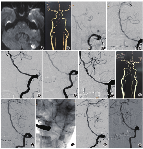 患者女,61岁。因"头晕伴行走不稳1年",于当地医院行MRI示左侧小脑半球、脑干梗死;CT血管成像(CT angiography,CTA)示右侧椎动脉纤细,V4段远端未见显影,左侧椎动脉V3段局部中度狭窄。予以药物对症治疗后,病情稳定好转出院。患者有糖尿病史10年,应用胰岛素治疗。出院后11个月复查,DWI示急性小脑及脑干梗死(图1),CTA显示左侧椎动脉进展为长节段闭塞(图2),急诊转我院。入院后DSA显示左侧椎动脉V3段长节段闭塞(图3),在全麻下实施左侧椎动脉闭塞开通术。穿刺右侧股动脉,置入6 F动脉鞘管,在泥鳅导丝配合下,将6 F ENVOY导引导管置于左侧椎动脉V2段,在SL10微导管配合下,将Traxcess14微导丝小心通过闭塞段。将SL10微导管跟进并跨过闭塞段后,造影确认其头端在基底动脉真管腔内,将Traxcess14微导丝沿微导管引入至左侧大脑后动脉P1段,微导丝尾端连接105 cm Traxcess Docking Wire后,交换撤出微导管系统,引入sprinter-legend(直径2 mm,长度12 mm)球囊至闭塞段,以8 atm(1 atm=101 325 Pa)压力充盈球囊扩张闭塞处,造影显示血管再通,残余狭窄40%(图4),随后更换sprinter-legend(直径2.5 mm,长度15.0 mm)球囊再次扩张狭窄处后,沿Traxcess14微导丝引入Wingspan(直径3 mm,长度20 mm)支架系统,准确定位后覆盖病变成功释放支架,造影显示支架展开良好,脑梗死溶栓血流分级(thrombolysis in cerebral infarction,TICI)3级(图5)。术后患者恢复良好,改良Rankin量表(modified Rankin Scale,MRS)评分1分。