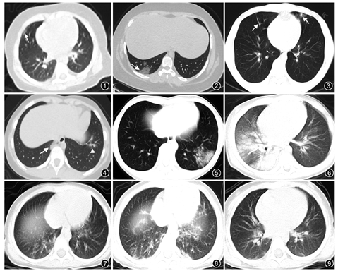 儿童及成人COVID-19患者病变部位均多位于双肺外带胸膜下,病灶多发[4],但成人病灶分布更广泛、更弥漫[5],呈"反蝶翼征"多见,而儿童病灶都相对较局限,弥漫性分布相对少,"反蝶翼征"少见,磨玻璃影也不如成人典型,儿童病变较小,部分呈淡薄云雾状,典型铺路石征磨玻璃影在本组中仅占2例。类支气管肺炎改变也是儿童COVID-19的特点,本组3例,显示病变沿支气管血管束从外向内带走行,呈多个斑片状边界模糊影,如无家庭聚集性发病史易误诊为普通支气管肺炎。本组患儿均未见胸腔积液及肺门淋巴结肿大等征象。