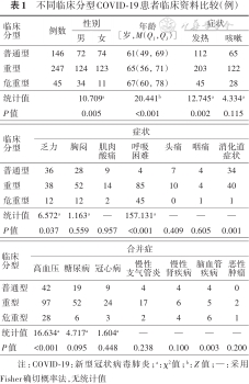 患者中重型及危重型年龄较大(P<0.05),且危重型患者以男性为主(P<0.05)。各临床分型患者的临床表现均以发热为主,其次为咳嗽、乏力、胸闷、呼吸困难、消化道症状等。发热作为COVID-19患者快速诊疗的主要症状,在本研究中表现为从普通型到危重型的比例逐渐增大(P=0.002)。同时,呼吸困难明显随着临床分型的加重而更为普遍(P<0.001);此外,危重型患者往往合并慢性基础疾病,在本研究中以高血压最为常见(62.2%,28/45)(表1)。