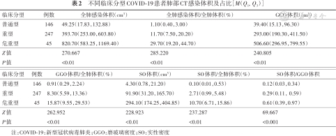 | 临床分型 | 例数 | GGO体积/全肺体积(%) | SO体积(cm³) | SO体积/全肺体积(%) | SO体积/GGO体积 |