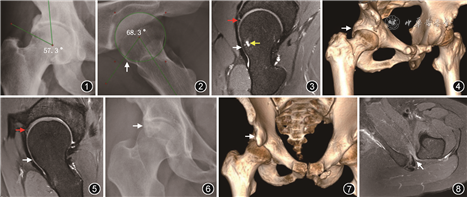 MRI和MR关节造影除了可以显示骨性结构异常以外,还可以显示髋臼盂唇撕裂及关节软骨损伤[6]。对于怀疑FAI的患者的MRI或MR关节造影检查要求单髋扫描,扫描方位主要包括冠状面、横断面、矢状面及平行于股骨颈长轴的斜轴面,而放射状扫描可以减少常规MRI扫描序列产生的图像扭曲和部分容积效应,提高显示髋臼盂唇撕裂和关节软骨损伤的能力[3]。下肢牵引MR关节造影可以使关节液或对比剂进入股骨头与髋臼之间的间隙,提高显示关节软骨损伤的能力[7]。