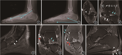 6.足底筋膜:足底筋膜是重要的支持结构,防止足底延长以及支撑足弓。跗骨与足底筋膜在侧位上构成一个三角形结构,足底筋膜是这个三角形结构的“拉杆”,当足趾背伸、足跟升高时,足底筋膜会拉紧,从而牵引足跟和跖骨头,缩短足底并抬高足弓,当足底筋膜松弛时,足弓降低。部分学者认为足底筋膜是维持足弓最关键的结构,但足底筋膜异常和AAFD之间关系并不明确。足底筋膜最常见病变是退行性足底筋膜炎,MRI上表现为其跟骨附着处筋膜增厚(>4 mm)、形态不规则、信号强度不均匀增高,并伴有不同程度的筋膜周围软组织肿胀和骨髓水肿(图8)。
