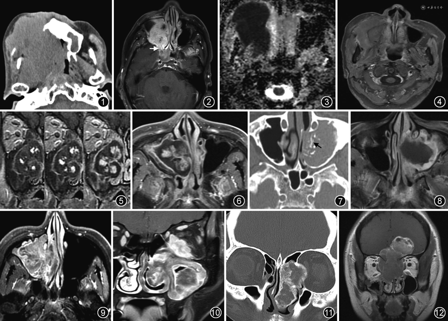 1.软组织肿块伴骨质破坏:可见于鳞癌、腺样囊性癌、恶性黑色素瘤、淋巴瘤等恶性肿瘤,出血坏死性鼻息肉和黏液囊肿等良性病变以及侵袭性真菌性鼻窦炎[3,5, 6, 7,10, 11,15]。(1)鳞癌为最常见的恶性肿瘤,表现为溶骨性骨质破坏、窦腔扩大,常通过骨质破坏区侵犯周围结构(图1),肿块的密度或信号不均匀,增强后不均匀强化,无特异性[2, 3,16]。(2)邻近的三叉神经分支增粗且强化,常提示为腺样囊性癌或鳞癌等,腺样囊性癌更常见[16](图2)。(3)腺样囊性癌常含有腺样结构和散在的微囊性结构,其ADC值与良性肿瘤相似,因此,在ADC图上肿块信号不低时,不能除外腺样囊性癌。(4)骨质破坏呈渗透性且骨质轮廓存在,典型表现呈“虚线状”骨质破坏,肿块与脑实质比较呈均匀等密度或等信号,DWI显示扩散受限,ADC值明显减低,增强后呈轻度或中度均匀强化,提示为淋巴瘤[2,10, 11,16](图3,4)。(5)肿块内可见片状或不规则T1WI高信号影、T2WI低信号影,可见于出血坏死性鼻息肉、侵袭性真菌性鼻窦炎、海绵状血管瘤、恶性黑色素瘤和伴出血的其他肿瘤[2,5,7,13, 14,16]。(6)动态增强扫描肿块呈“渐进性强化”(必须观察各时相图像才能准确判断),但增强后较长时间仍有部分区域未强化,提示为出血坏死性鼻息肉[7](图5,6)。(7)动态增强扫描肿块呈“渐进性强化”且最后能完全强化,提示为海绵状血管瘤[14]。(8)含色素较多的恶性黑色素瘤在鼻内镜下呈黑色或棕色肿块,T1WI呈高信号影、T2WI呈低信号影,增强后中度不均匀强化,诊断相对比较容易,但色素较少或无色素的恶性黑色素瘤表现不典型,常误诊为鳞癌等其他病变,只能依靠活检病理诊断[13]。(9)上颌窦腔扩大,窦壁呈吸收性骨质破坏导致骨壁缺损,病变可突入眼眶或颌面部,增强后肿块无强化而周边黏膜环形强化,提示为黏液囊肿[15]。
