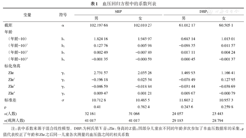 注:表中系数来源于混合线性模型。DBP5为柯氏第Ⅴ音;Zht:身高的Z值;因部分儿童在不同的年龄多次参加了本血压数据库的采集,ρ值代表校正了年龄和Zht之后同一儿童各次测量的血压值之间的相关系数