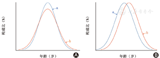 指标"标化年龄别发病构成比"可以调查人口年龄结构的影响,并且理论上所有年龄组构成比之和为100%,因此比较曲线分布变化可以从整体分布判断年龄变化趋势。如图1所示,A图中a、b两条曲线分布近似,但是b曲线的峰值下降,低年龄组和高年龄组的构成上升,而B图中,b曲线整体右移,所以b相对a则呈现老龄化趋势,而a相对于b则呈现年轻化趋势。