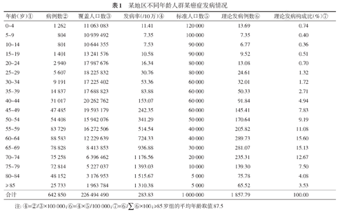 根据表1数据可得,平均发病年龄=(1 262×2.5+804×7.5+…+48 152×82.5+25 733×87.5)/642 850=63.07(岁);标化平均发病年龄=(13.69×2.5+7.35×7.5+…+75.78×82.5+65.52×87.5)/1 857.79=60.70(岁);根据肿瘤监测的实际数据看,85岁及以上组的个案数据计算的平均年龄近似等于87.5岁,因此,建议年龄变化的相关研究中对85岁及以上组的平均年龄取值87.5岁,可以为相关数据比较建立统一标准。