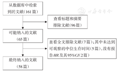 利用PubMed检索平台检索2014年1月至2018年12月发表在新英格兰医学杂志的肿瘤治疗领域的随机对照临床试验,关键词为:Neoplasms、Cancer、Carcinoma、Tumor、Cox和Hazard等,检索截至时间为2018年12月29日。检索限制在人类研究。纳入的研究是随机对照试验的全文报告。文献的纳入标准为:(1)癌症研究;(2)研究中有生存曲线的数据;(3)随机对照临床试验。排除标准为:(1)未观察到中位生存时间;(2)没有报告总生存期(overall survival,OS)和无进展生存期(progression-free survival,PFS);(3)没有报告HR及其95%CI值的文献。根据纳入和排除标准对检索到的文献进行筛选。从合格的文献中摘录题目、发表年份、中位总生存期和/或中位无进展生存期、HR及其95%CI值和样本量。共检索到161篇文献,根据摘要和标题筛查中排除96篇文献,全文筛查中排除无HR及其95%CI值的文献2篇,排除未观察到中位生存时间的文献5篇。最终共纳入58篇文献。文献检索和筛选流程图见图1。
