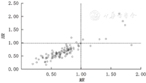 在检索到的58篇文献中,共收集到110个HR-MR对子,经配对样本t检验结果表明:在α=0.05的水平上,两组差异有统计学意义(t=2.311,P=0.023)。其中HR与MR数值大小完全相等的对子数有7个(6.36%,7/110),HR与MR方向相反(即MR>1而HR<1或MR<1而HR>1)的对子数有4个(3.63%,4/110),中位生存时间与风险比之间的散点图如图2所示,相关系数为0.86(P<0.01)。