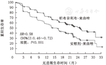 以Finn等[2]的研究为例,该试验比较了来曲唑联合帕布昔利布与单独使用来曲唑对晚期乳腺癌患者的疗效,样本量为666人,中位随访时间为23个月。图3显示了研究人员评估的晚期乳腺癌患者接受治疗后的中位无进展生存时间曲线图,是HR与MR完全一致的实例。从图中可以看出,来曲唑联合帕布昔利布组的中位无进展生存时间为24.8个月,而来曲唑组的中位无进展生存时间为14.5个月,MR为0.58(14.5/24.8),而HR为0.58(95%CI为0.46~0.72)。观察两条生存曲线发现,两条曲线趋势基本一致,且无交叉,符合风险比例假定[3]。因此在不违反比例风险假定的前提下,HR与MR表现出良好的一致性。