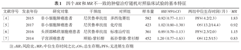 表1描述了4篇[4,5,6,7]HR与MR不一致论文的基本信息,包括第一作者、发表年份、样本量大小、HR(95%CI)、两组中位生存时间、MR等。这四篇论文的HR和MR的点估计值都分别指向了不同的方向。