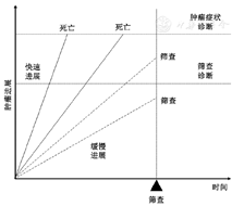 在流行病学研究中,常常出现病程较长的疾病预后较病程短的疾病更好的现象[2]。原因在于病程长的疾病临床前滞留期时间相对较长,使该部分患者更容易被检测出并得到及时的治疗,进而延长其预后生存时间。当在该受试人群中评价筛查试验的效果时,筛查组的部分患者由于病程长或疾病进展缓慢而导致临床获益增加,进而夸大筛查的效果,详见图4。与领先时间偏倚相比,病程长短偏倚的识别更为困难。鉴于筛查试验更倾向于检测出病程较长或进展缓慢的受试者,如良性肿瘤患者,因此根据受试人群中良性和恶性肿瘤患者的检出比例可以定性的判断病程长短偏倚的存在。