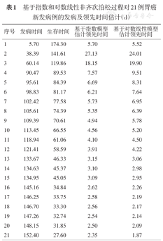 | 序号 | 发病时间 | 生存时间 | 基于指数模型估计领先时间 | 基于对数线性模型估计领先时间 |