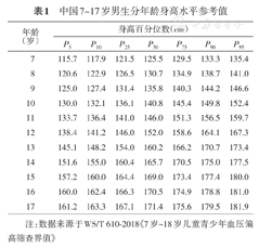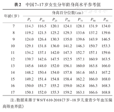 依据WS/T 610-2018提供的"7岁~17岁儿童青少年分年龄身高水平参考值" (表1、表2),判断测量身高所处相应年龄身高百分位组,如身高为116.0 cm的7岁男生所对应的身高百分位数组为≥P5。