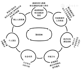 基于对新型冠状病毒性肺炎的现有认识,加上春节人员出行高峰,我国在疫情前期,对湖北武汉市等高疫情地区采取了围堵策略,目的是尽快将疫情控制在武汉市等有限地区,防止向我国其他地区和境外扩散。其核心措施包括:(1)疫区封锁、交通管控和限行,减少人员流动,防止疫情随人员出行播散;(2)加强病例发现、隔离治疗和密切接触者追踪管理,早期发现和有效管控传染源;(3)取消大型活动、学校春节假期推迟开学、工厂延迟复工、延长春节假期、增加人际距离以减少感染者与易感者之间的接触和暴露机会;(4)加强交通工具和公共场所的环境卫生、通风和消毒,以有效切断传播途径;(5)落实医疗机构的预检分诊、严格探视制度、做好医护人员的个人防护,防止医院内的交叉感染;(6)加强卫生宣传,倡导公众外出戴口罩、注意呼吸道礼仪、手卫生等个人防护措施,保护易感人群。